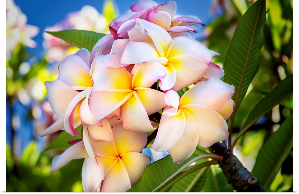<p>Close-up of pink plumeria flowers and blue sky; Lanai, Hawaii, United States of America</p>