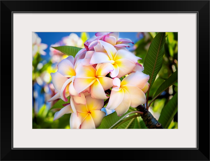 <p>Close-up of pink plumeria flowers and blue sky; Lanai, Hawaii, United States of America</p>