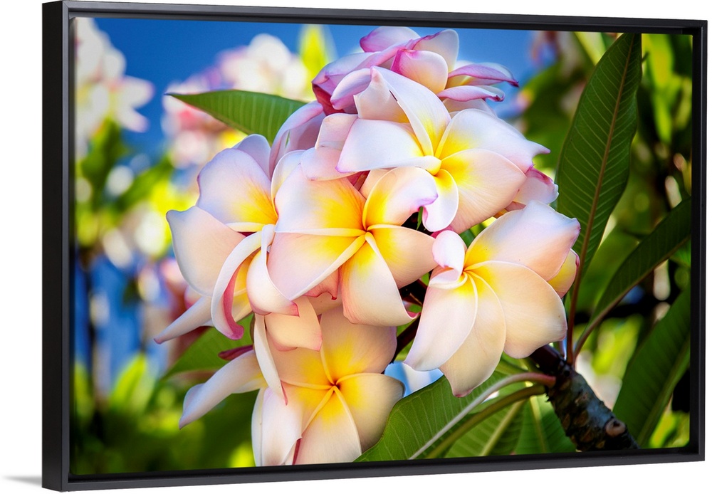 <p>Close-up of pink plumeria flowers and blue sky; Lanai, Hawaii, United States of America</p>
