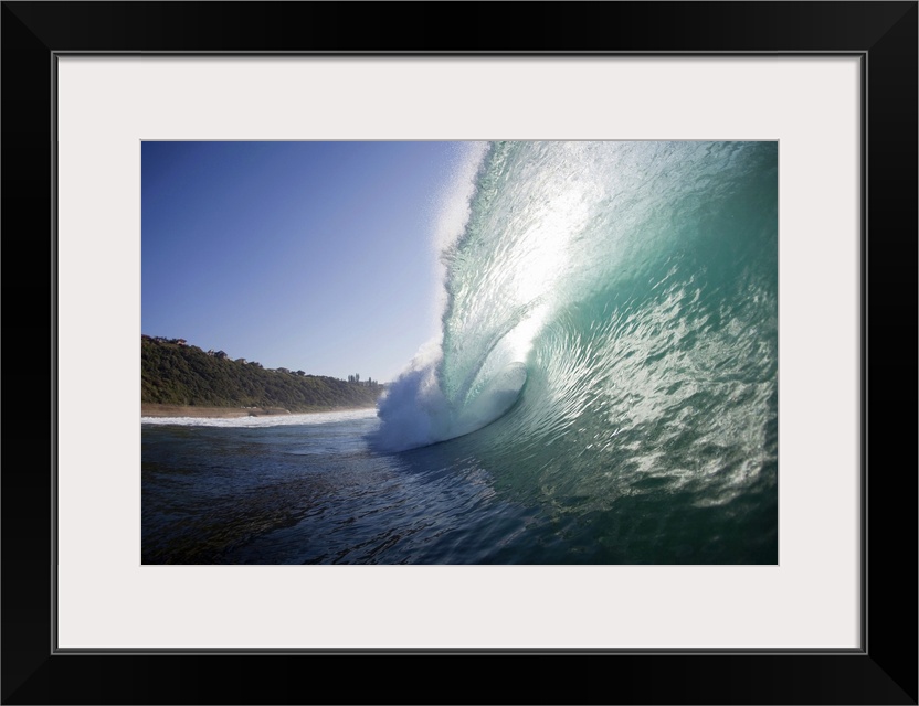 <p>Outdoor photo of a wave curling up and breaking over towards the beach on a sunny day.</p>