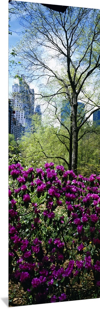 <p>Tall and narrow canvas photo of flowers in NYC with tall skyscrapers in the distance.</p>
