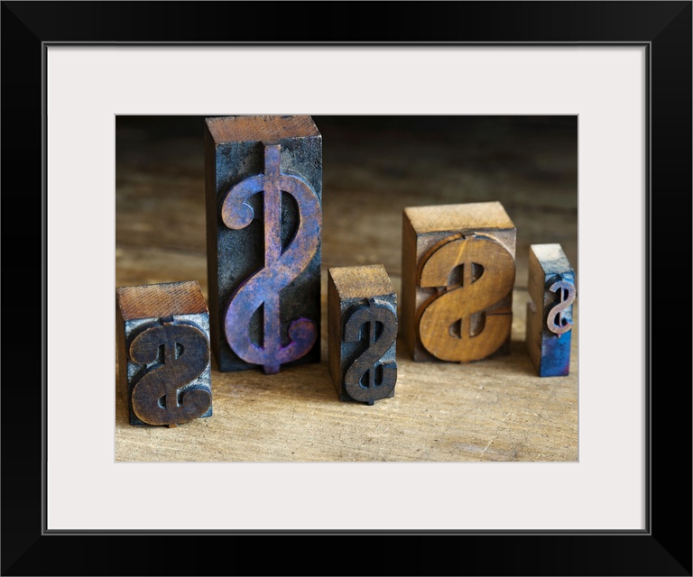 <p>Close up of printing blocks with dollar sign on wood</p>