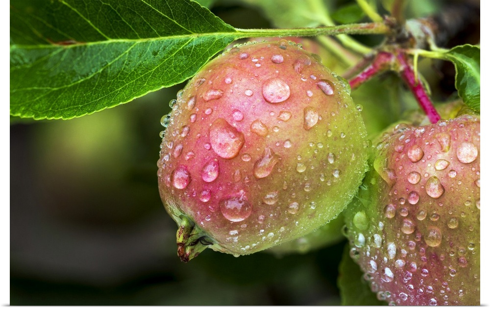 <p>Close-up of red apples with rain droplets on a branch of a tree; Calgary, Alberta, Canada</p>