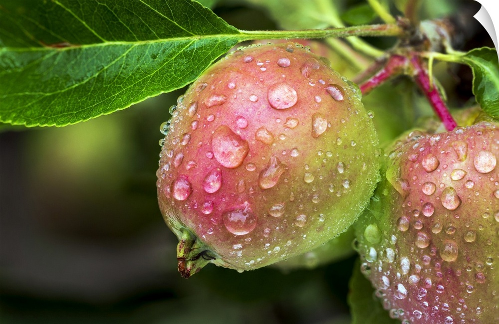 <p>Close-up of red apples with rain droplets on a branch of a tree; Calgary, Alberta, Canada</p>