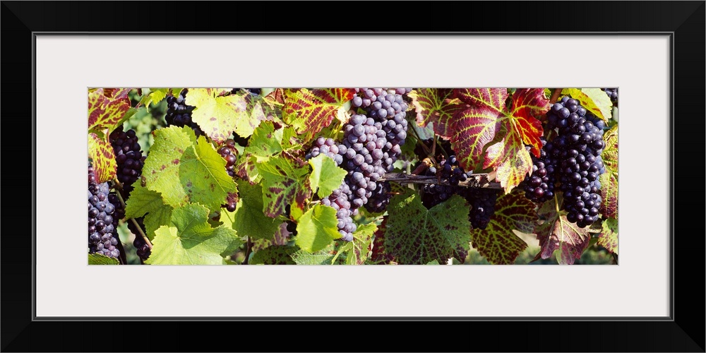 <p>Vines and grapes are photographed closely as they grow in a vineyard.</p>