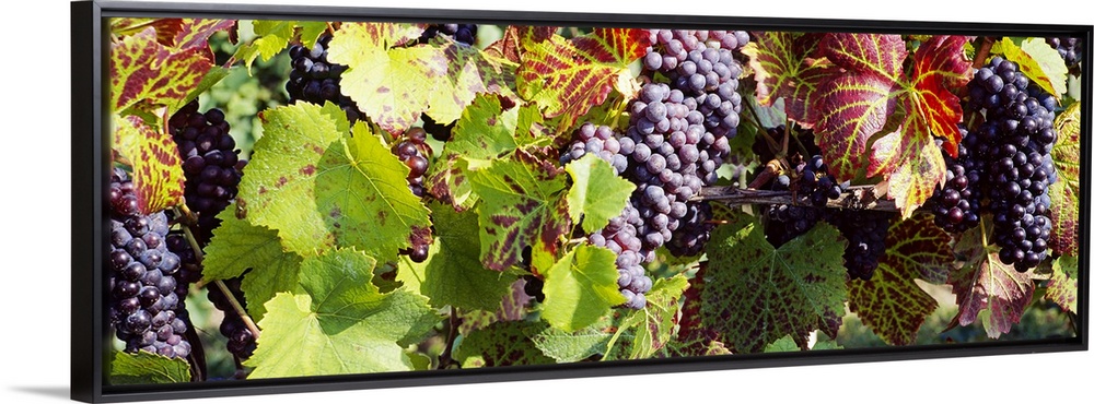<p>Vines and grapes are photographed closely as they grow in a vineyard.</p>