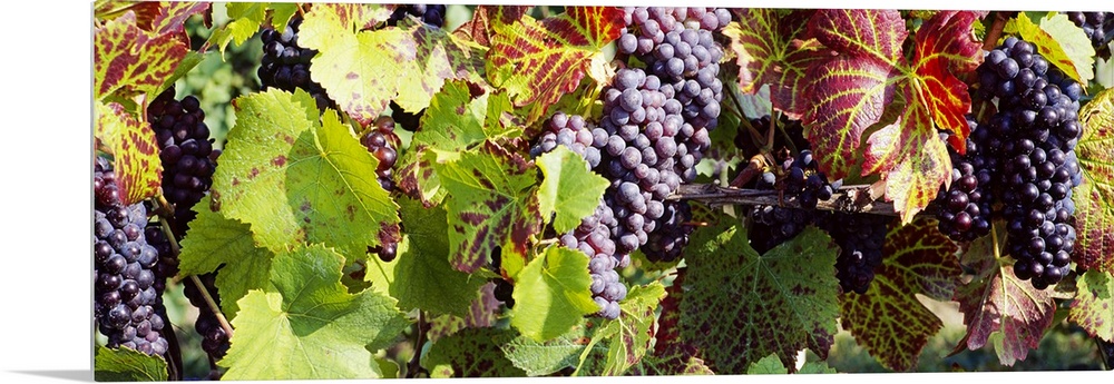 <p>Vines and grapes are photographed closely as they grow in a vineyard.</p>