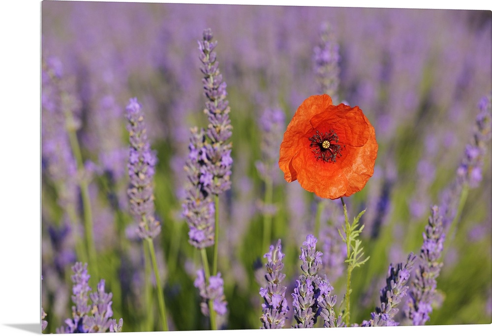 <p>Close-up of Red Poppy in Lavender Field, Valensole Plateau, Alpes-de-Haute-Provence, Provence, France</p>