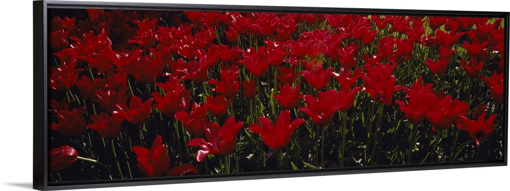 <p>This is a panoramic shaped photograph that is a close up flowers growing together in the spring.</p>