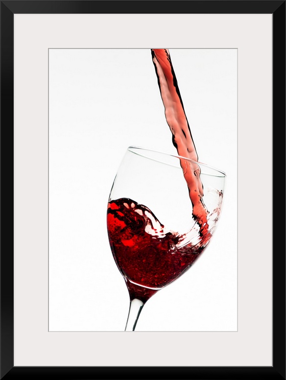 <p>Vertical photograph on a large wall hanging of a stream of red wine as it's poured into a slightly tilted, clear wine glass, on a solid white background.</p>