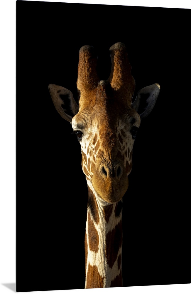 <p>Close-up of reticulated giraffe (giraffa camelopardalis reticulata) against black background, Segera, Laikipia, Kenya.</p>