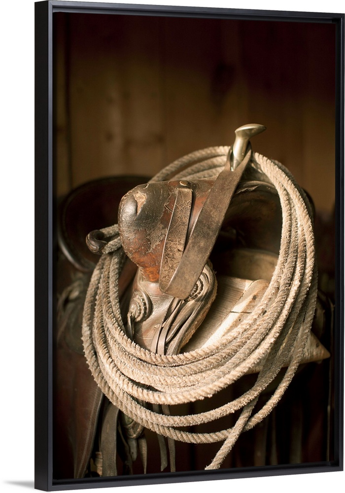 <p>USA, Colorado, Close-up of saddle with rope</p>