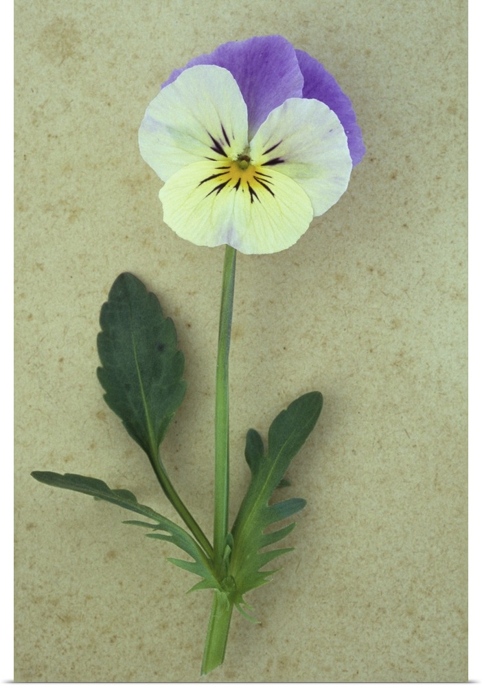 <p>Close up of single mauve and cream flower with stem and leaves of Pansy or Viola tricolor lying on antique paper</p>