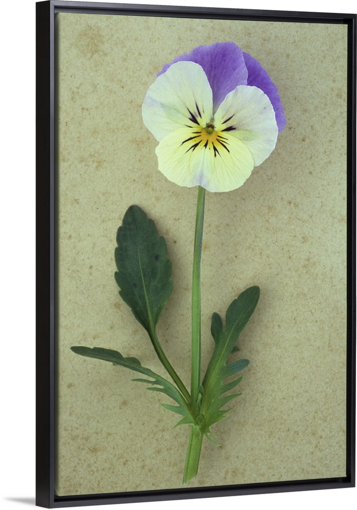 <p>Close up of single mauve and cream flower with stem and leaves of Pansy or Viola tricolor lying on antique paper</p>
