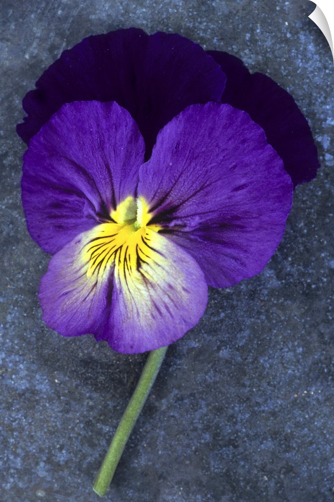 <p>Close up of single purple mauve and yellow flower of Pansy or Viola tricolor lying on tarnished metal sheet</p>