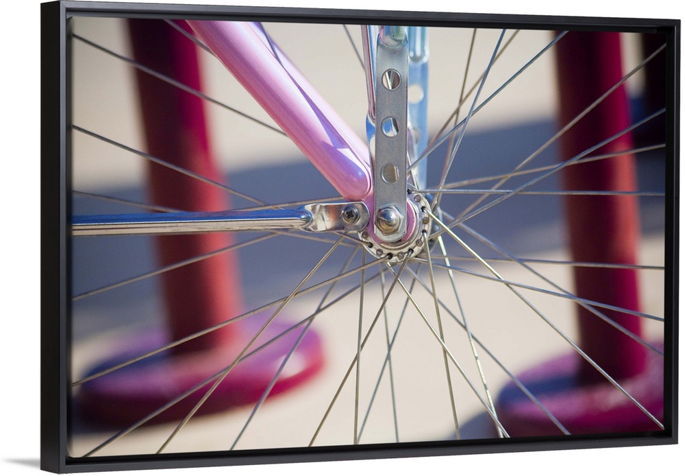 <p>Close up of spokes on a pink bicycle,</p>