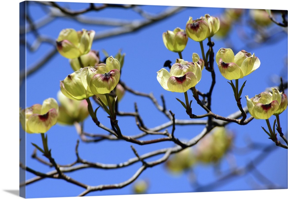 <p>Close up of the branches of a yellow dogwood tree, Cornus species, with delicate yellow blossoms in spring. Cambridge, Massachusetts.</p>