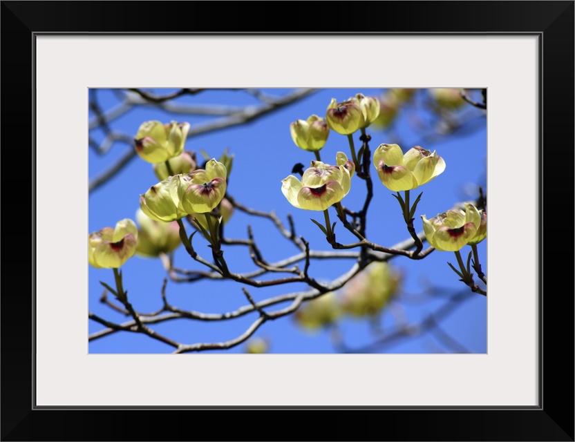 <p>Close up of the branches of a yellow dogwood tree, Cornus species, with delicate yellow blossoms in spring. Cambridge, Massachusetts.</p>