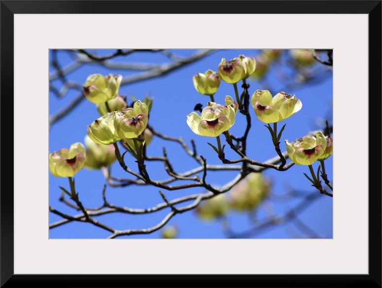 <p>Close up of the branches of a yellow dogwood tree, Cornus species, with delicate yellow blossoms in spring. Cambridge, Massachusetts.</p>