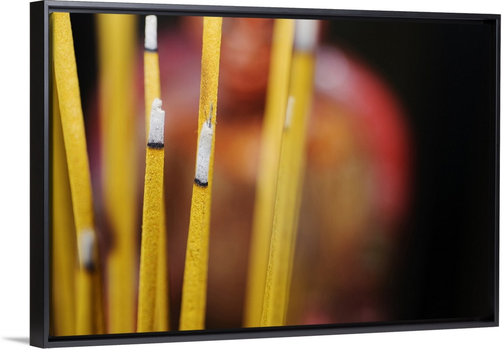 <p>Close-up of the burning incense that adorns a Buddhist shrine.</p>