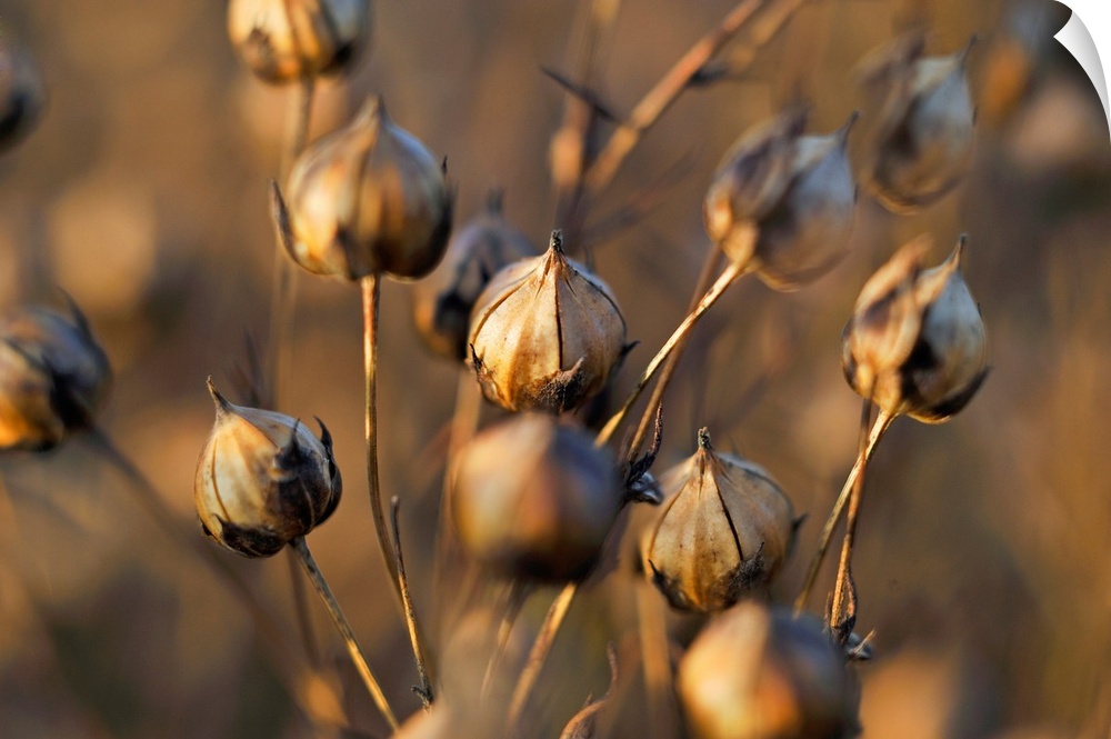 <p>Close-up of the capsules containing seeds in a mature flax field, Eure-et-Loir department, Centre-Val de Loire region, France, Europe</p>
