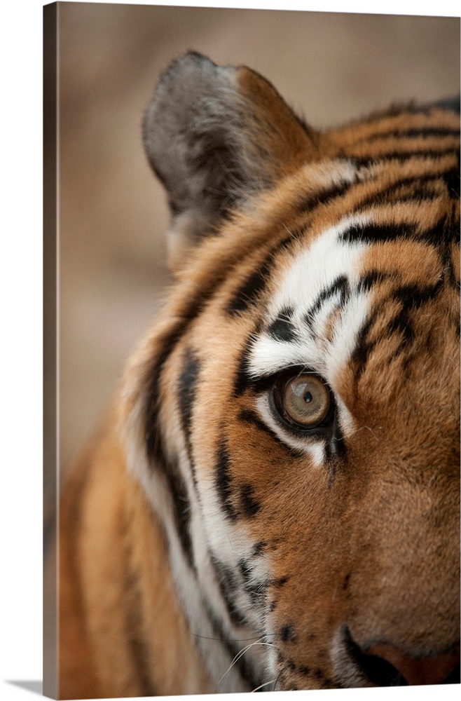 <p>Close-up of the face of an amur tiger (panthera tigris altaica), also called a Siberian tiger, with detail of the fur markings and eye, Omaha, Nebraska, united states of America.</p>