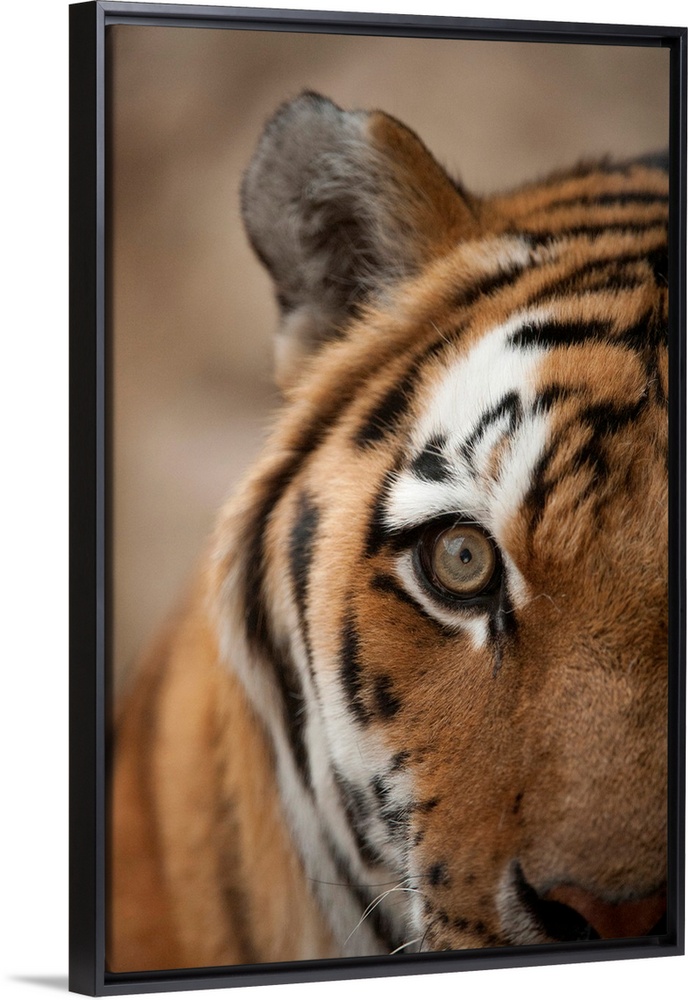<p>Close-up of the face of an amur tiger (panthera tigris altaica), also called a Siberian tiger, with detail of the fur markings and eye, Omaha, Nebraska, united states of America.</p>