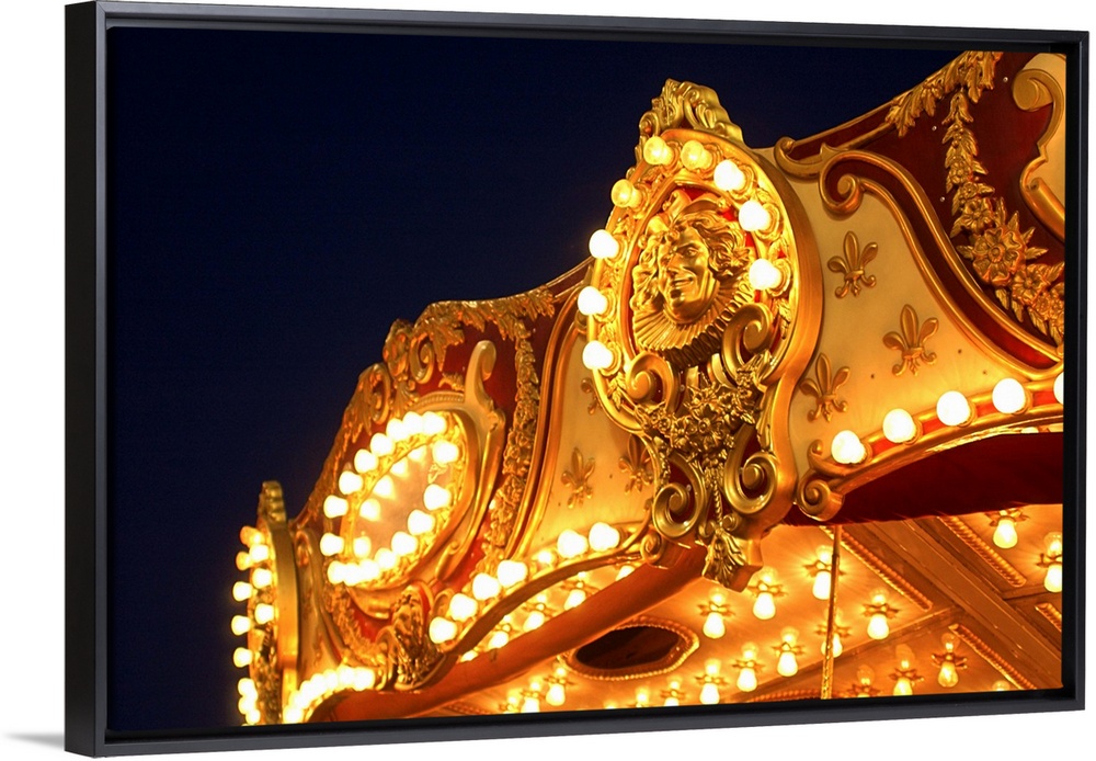 <p>Close-up of the lights and ornate artwork on the top of a merry-go-round at a fair.</p>
