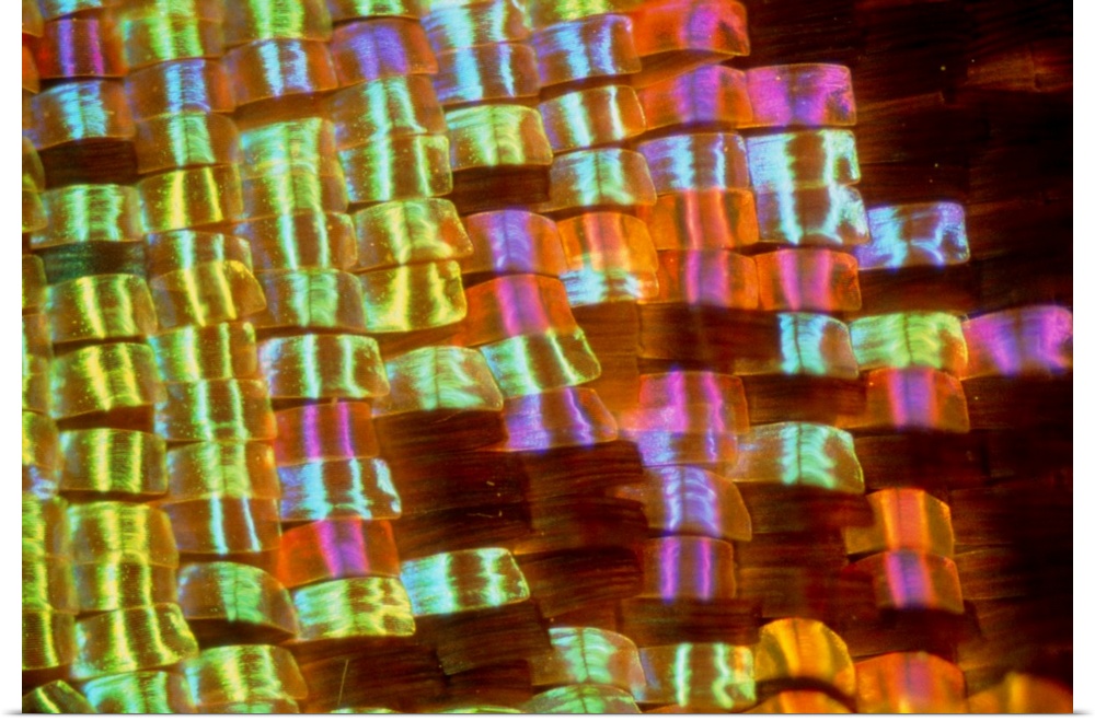 <p>Close-up of the wing of the butterfly Urania madagascariensis, showing the glowing colours of the scales which cover the wing surface. These small scales overlap like shingles, each with an individual colour, and together they produce the magnificent colours and patterns of the butterfly wing. Urania madagascariensis is one of the largest and most beautiful species of uraniid butterfly; the scale colours glow in shades of blue, green, red and gold. As light is needed to display the iridescent colours, this butterfly is active during the day. Urania madagascariensis is found in Madagascar.</p>
