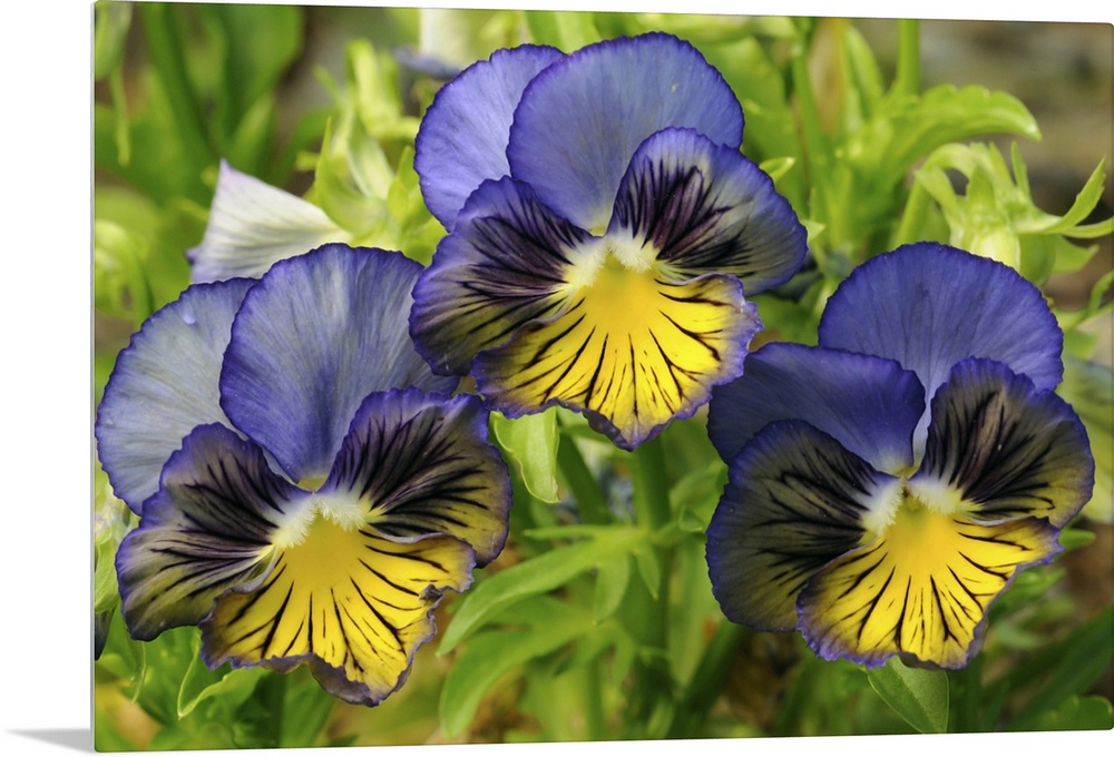 <p>Close up of three blue and yellow pansies, Viola tricolor. Cambridge, Massachusetts.</p>