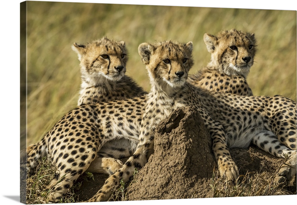 <p>Close-up of three cheetah cubs (acinonyx jubatus) lying together, Serengeti, Tanzania.</p>