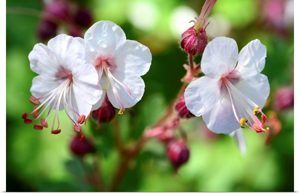 <p>Close up of three white and pink flowers.</p>
