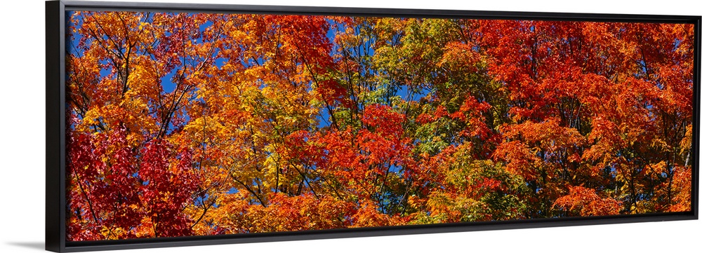 <p>Panoramic photograph focuses on the tops of a giant group of trees displaying their warm Autumn colors.</p>