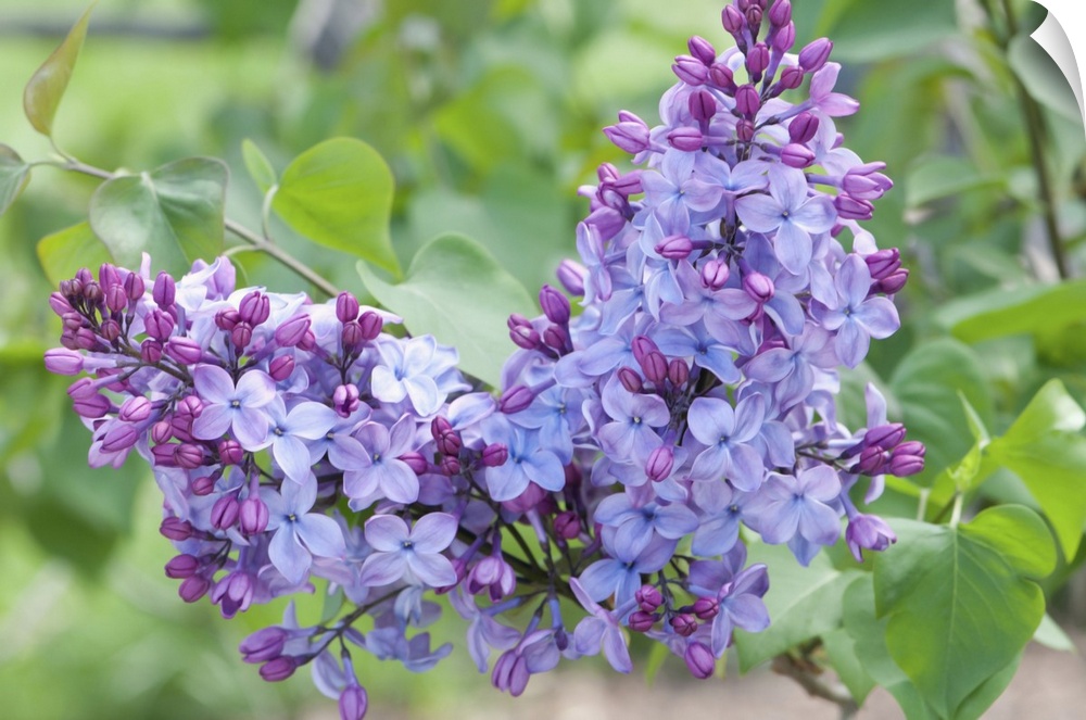 <p>Close up of two clusters of Louvois lilac flowers, Syringa x hyacinthiflora, in spring. Arnold Arboretum, Jamaica Plain, Massachusetts.</p>