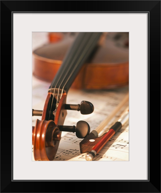 <p>Close up of violin scroll and bow on sheet music</p>