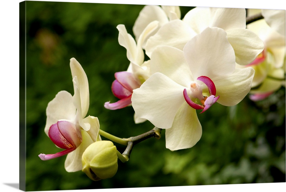 <p>Horizontal photograph from the National Geographic Collection of blooming moth orchids, the phalaenopsis species, on an out of focus background of green foliage.</p>