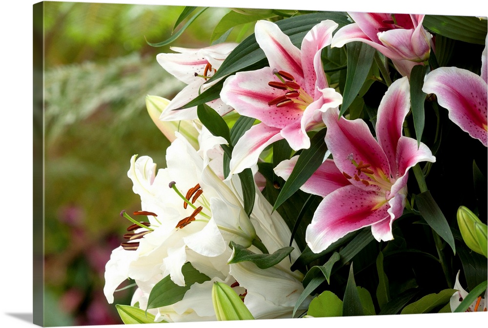 <p>Close up of white and red lily flowers, buds and leaves in spring.</p>