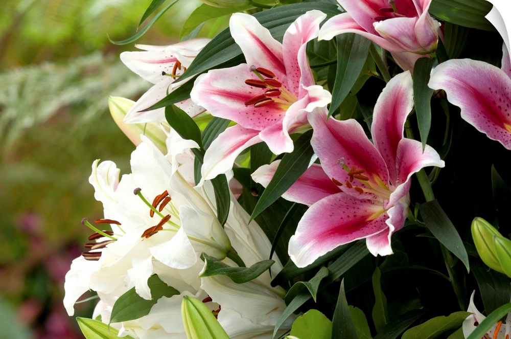 <p>Close up of white and red lily flowers, buds and leaves in spring.</p>