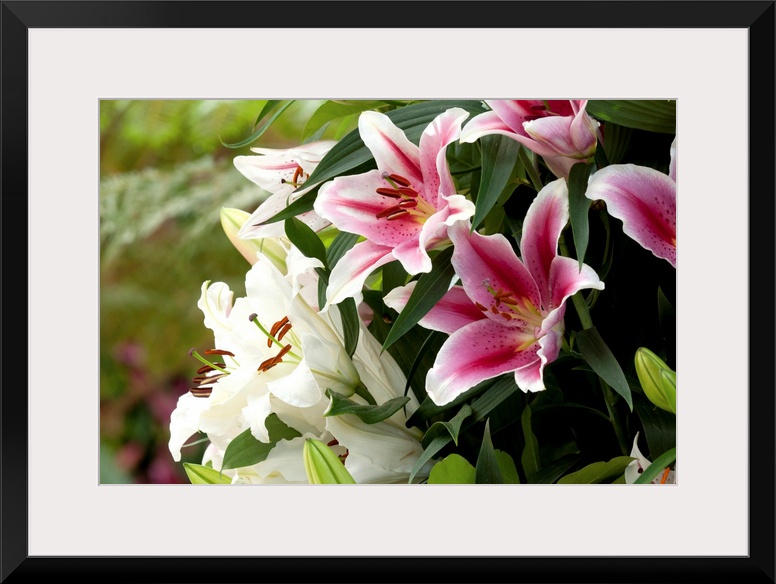 <p>Close up of white and red lily flowers, buds and leaves in spring.</p>