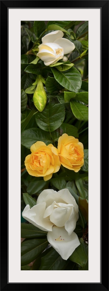 <p>Close-up of White Poppies with yellow Roses</p>