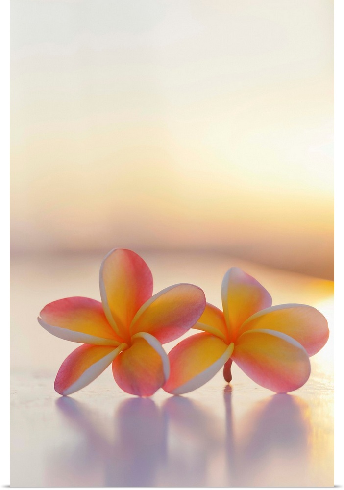 <p>Close-up of a pair of beautiful yellow and pink Plumeria flowers (Apocynaceae) with sunset lighting the background; Honolulu, Oahu, Hawaii, United States of America</p>