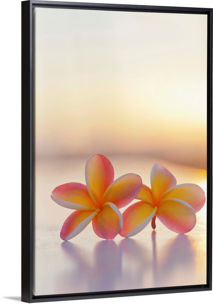 <p>Close-up of a pair of beautiful yellow and pink Plumeria flowers (Apocynaceae) with sunset lighting the background; Honolulu, Oahu, Hawaii, United States of America</p>