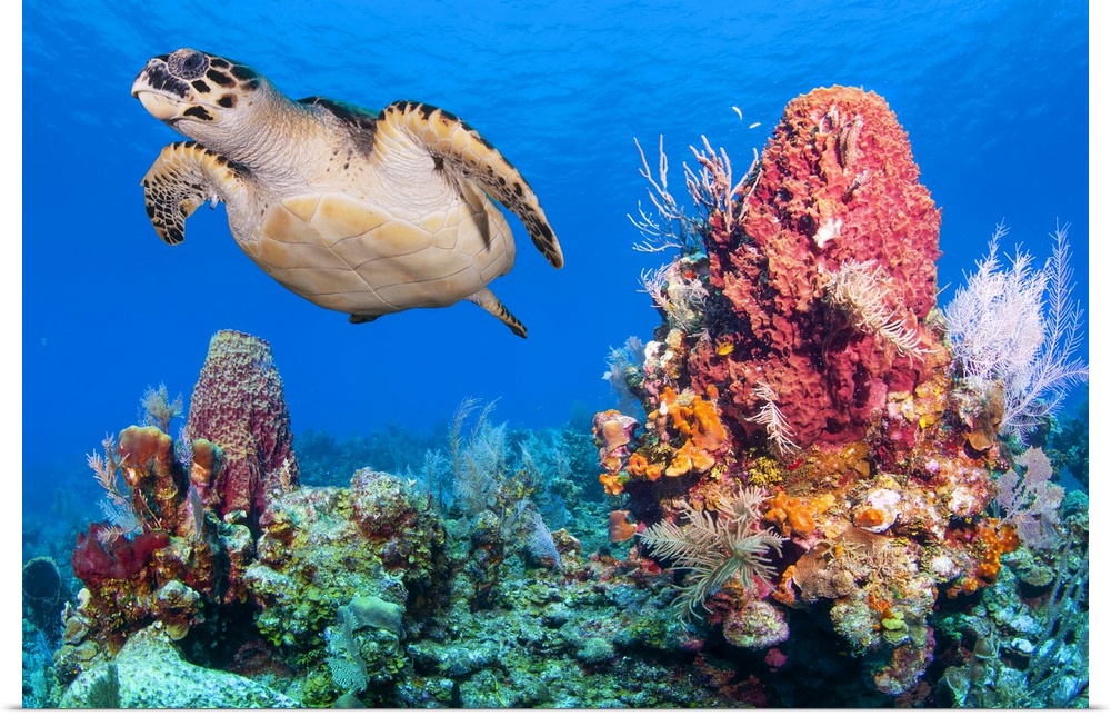 <p>Close up photo of a Green sea turtle (Chelonia mydas) swimming next to a giant red barrel sponge (Xestospongia muta), Bay Islands (Islas de la Bahia), Honduras, Central America</p>