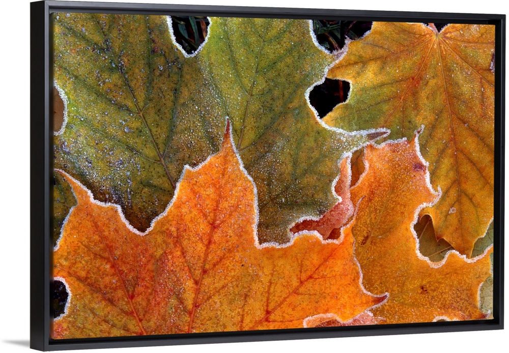 <p>Canvas art of warm toned autumn leaves outlined with cold frost.</p>