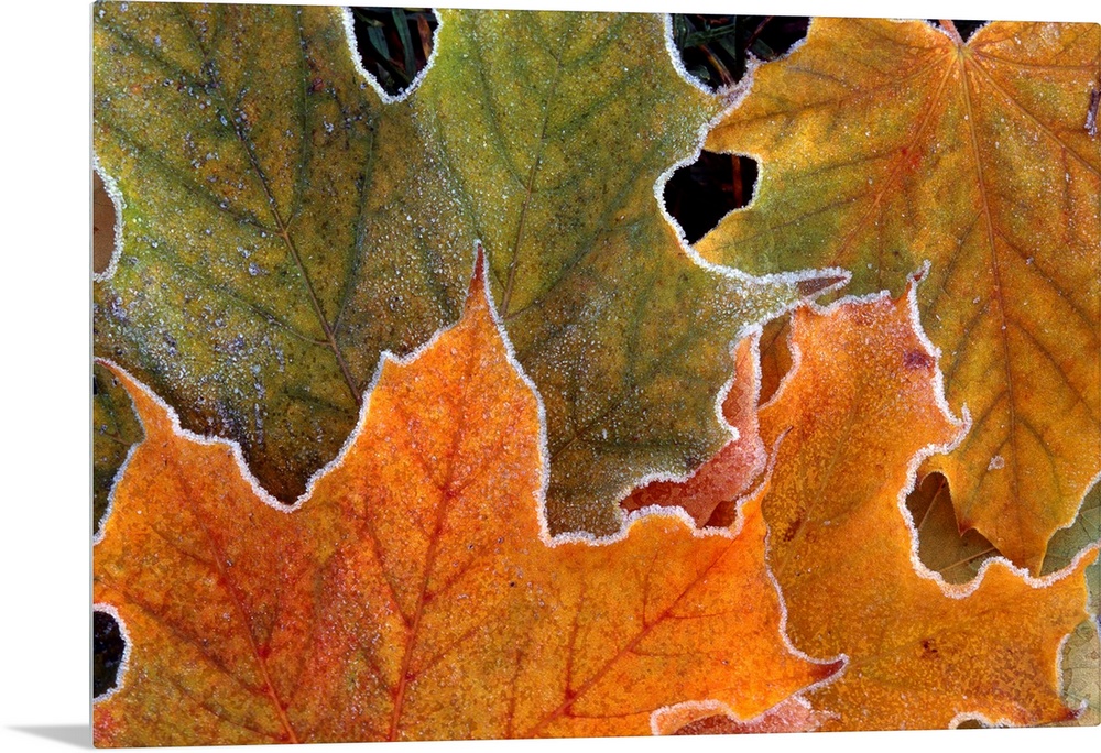 <p>Canvas art of warm toned autumn leaves outlined with cold frost.</p>