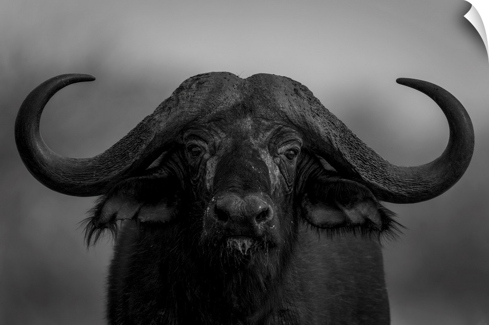 <p>Mono, close-up portrait of a Cape Buffalo (Syncerus caffer) standing, eyeing camera in Segera, Segera, Laikipia, Kenya</p>