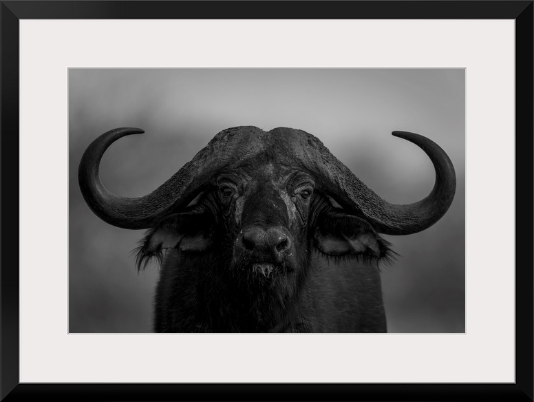 <p>Mono, close-up portrait of a Cape Buffalo (Syncerus caffer) standing, eyeing camera in Segera, Segera, Laikipia, Kenya</p>