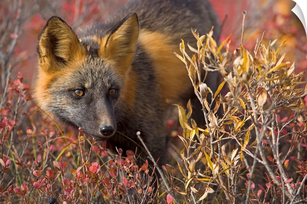 <p>Close up portrait of a cross fox peering through blueberry and willow shrubs in Denali National Park, Alaska, Interior, Fall</p>