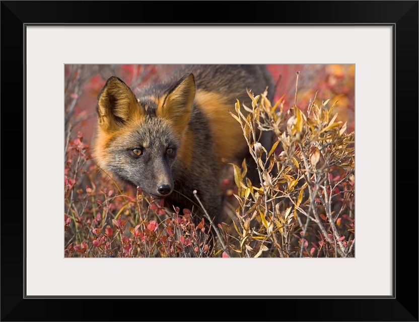 <p>Close up portrait of a cross fox peering through blueberry and willow shrubs in Denali National Park, Alaska, Interior, Fall</p>