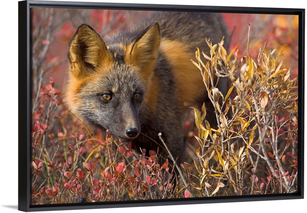 <p>Close up portrait of a cross fox peering through blueberry and willow shrubs in Denali National Park, Alaska, Interior, Fall</p>